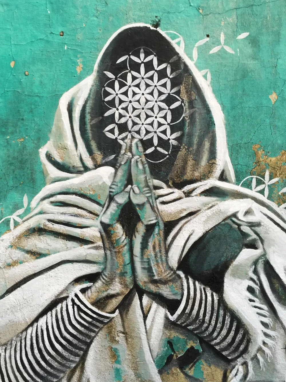My contribution of murals to the Beatles Ashram reflects my experiences, observations, and human connections in Rishikesh. Mandala style auras surround the subjects as their forms dematerialize into geometric patterns. The process of shedding their egos ultimately unifies them with a universal creative force.